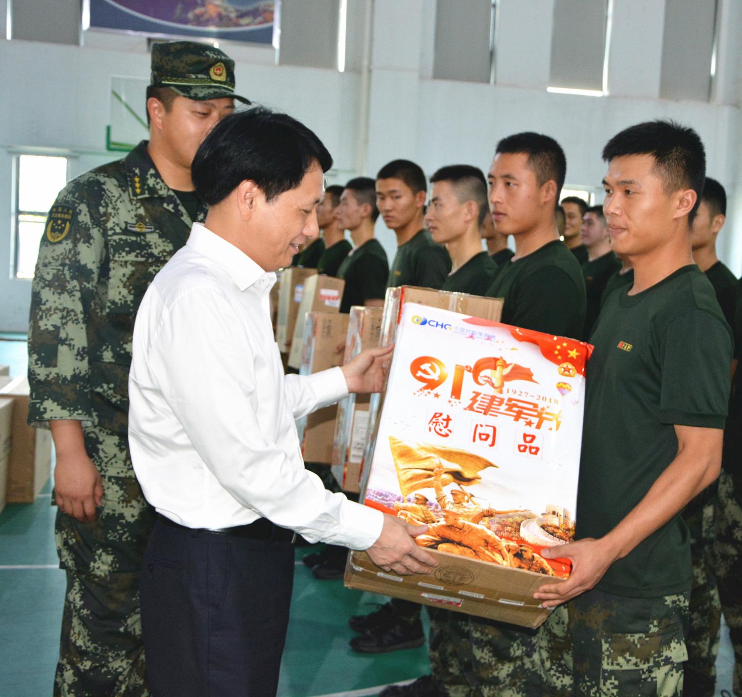余董事长为战士们递上慰问品
