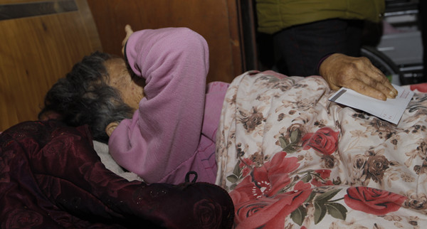 爱心慰问的第一户来到了袁家翠老人家中。她今年73岁,因严重的关节炎瘫痪在床。老伴已经离世,小儿子也有些残疾,至今未能成婚,尚需家中的照拂。自从瘫痪在床后,老人的两个儿媳妇就轮流照顾她,为了让她睡得更舒服,两兄弟为她修了新房,买了电热毯等。