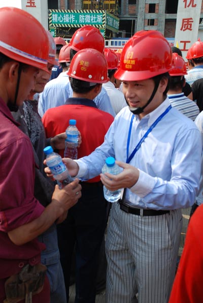清凉在手中传递,温暖在心中涌流。建筑工人们虽然汗流浃背,但慰问组的到来、政府及集团领导的关心,使他们感到了阵阵的凉爽,并感受到了家的温馨。
