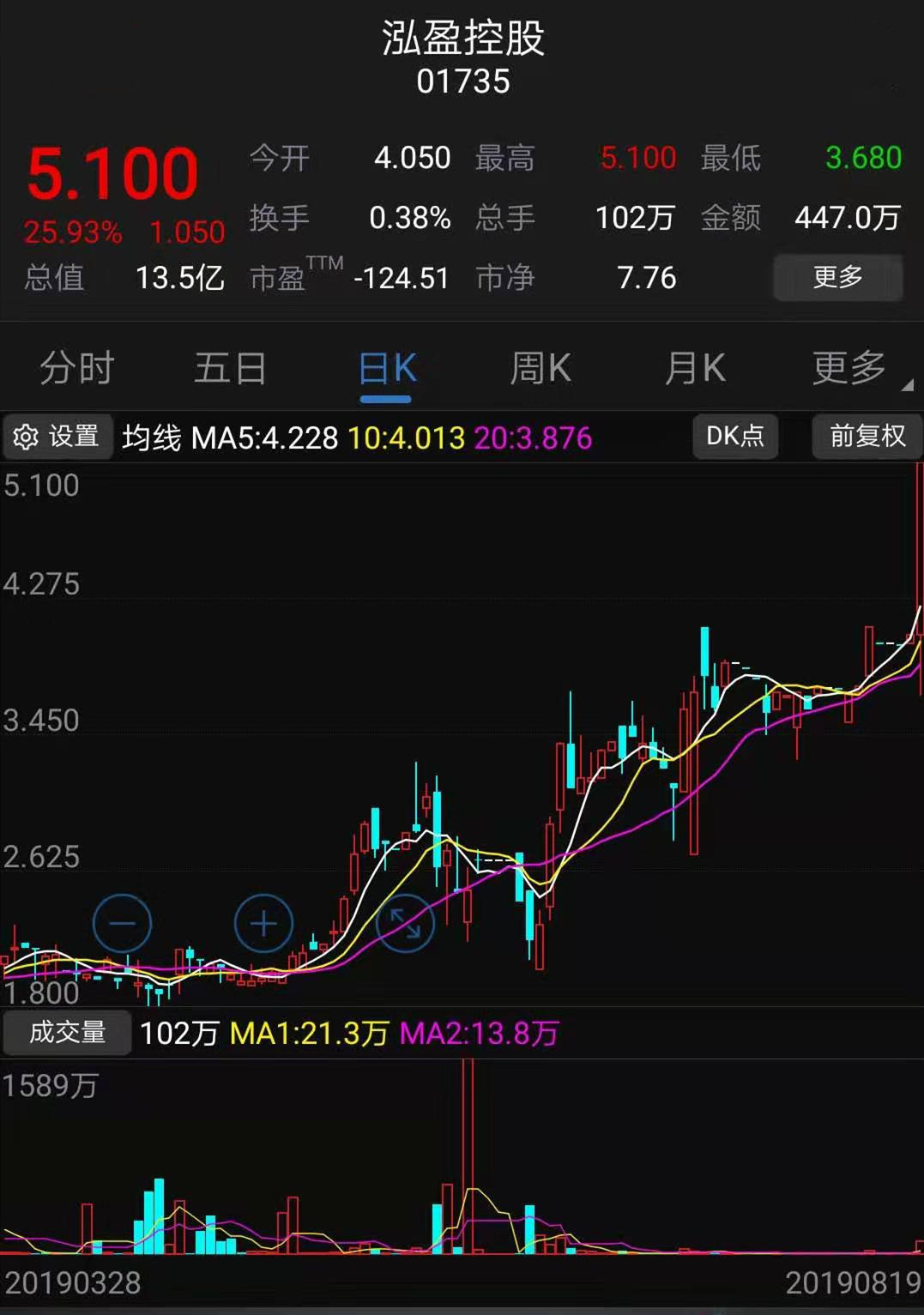 泓盈控股(01735.HK)复牌大涨逾25.93%,报5.1港元,成交447万港元,总市值13.5亿港元