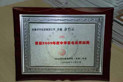 ——余竹云荣获“2009年度中华百名优秀徽商”称号