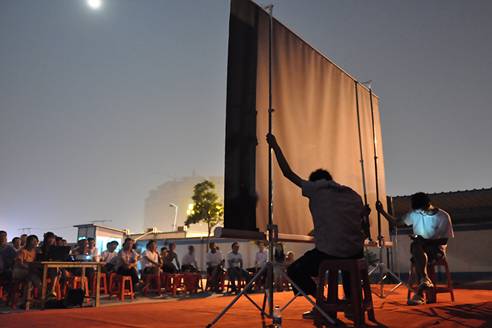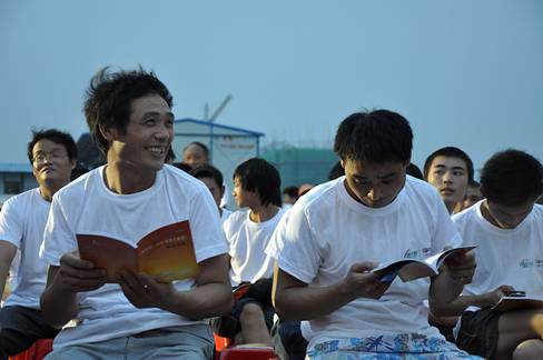 志愿者们为农民工放映精彩的电影