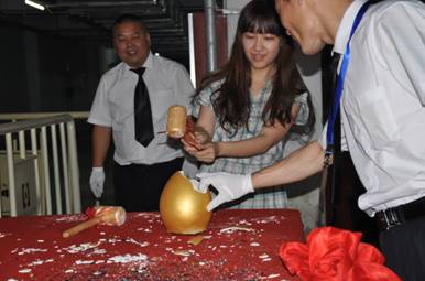 这是交房最后一个环节——“砸金蛋”。所有的业主都可以在此收获一份惊喜。据了解,每天都有一台空调、3台豆浆机、5台电磁炉以及若干百元礼券被送出。“为业主入驻国际生活再添一份荣耀。为业主再送一份尊贵。”营销部经理王涛如是解释道。