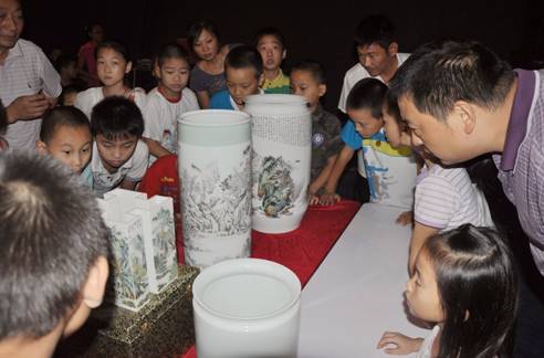 童子军和家长们参观现场展示的瓷器