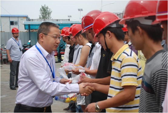 8月31日下午,受集团余竹云董事长委托,集团执行总裁乔晓戈,在集团工会领导的陪同下,深入到“星空体育网页版,星空体育(中国)官方网站登录界面城”项目现场,慰问挥汗战斗在“星空体育网页版,星空体育(中国)官方网站登录界面城”项目建设工地的农民工和监理公司的监理人员,项目公司、商业管理公司一线员工和集团有关中心在一线负责检查协调的工程管理技术人员。为2500多名农民工、一线员工送去防暑降温用品。“星空体育网页版,星空体育(中国)官方网站登录界面城”项目公司工程副总刘爱金、商业运营管理公司总经理邹建平等参加了慰问活动。