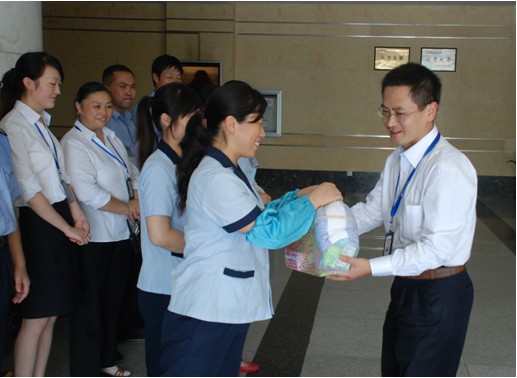 黄总为国际大厦管理处一线员工代表发防暑降温用品