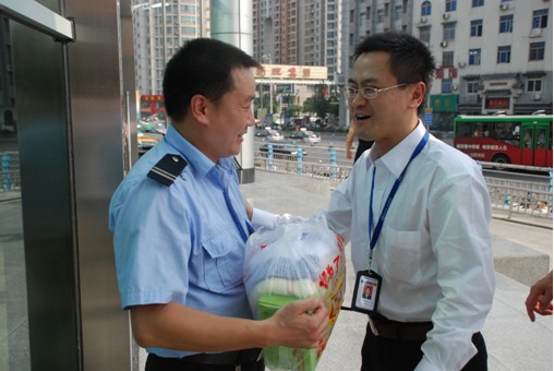 黄总为国际大厦管理处坚守岗位的保安发防暑降温用品