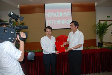 合肥市政府副市长卢仕仁向余竹云董事长颁发合肥市青年创业志愿导师团团长聘书