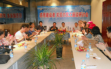 摄影作品参观结束后,当天活动的另一大主题——“感恩建设者,关爱农民工”座谈会在星空体育网页版,星空体育(中国)官方网站登录界面艺术馆会议室开始了热烈的讨论。座谈会围绕如何保护农民工权益、如何更好关爱农民工、如何找准切入点,寻求政府政策支持、如何帮助农民工学习文化知识、提升职业技能、更好更快融入城市生活等问题展开了企业、政府、农民工、媒体、公众的多方对话。这样零距离的关注和平等对话对促使关爱帮扶农民工长期持久机制化开展下去有重要意义。