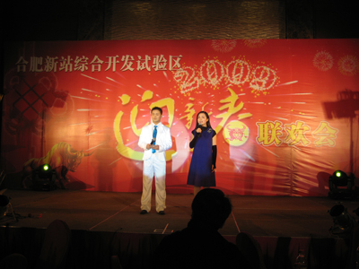 1月14日下午,合肥市希尔顿酒店活动厅内一片欢声笑语,合肥市新站综合开发试验区2009年迎新春联欢会在此举行。这台集舞蹈、相声、小品、歌曲、乐器演奏为一体的联欢会,节目内容丰富多彩,试验区领导和企业家们在欢歌笑语中度过了一个愉快的下午。