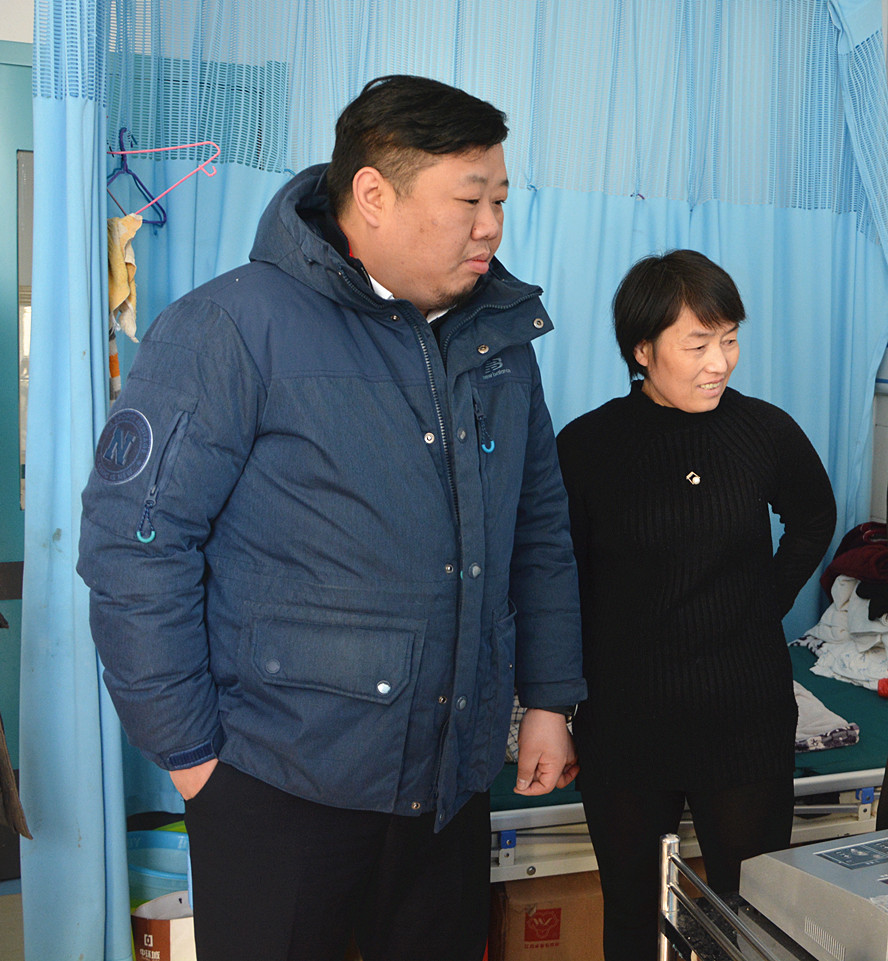 崎岖不平的小路上,积雪还未完全融化,在经过马不停蹄地顶着寒风赶路之后,郭总监一行终于来到了田桥街道三合社区的临泉县医养院。还未走进医院,马天便急急的上前迎接,并对领导的慰问表示感谢。