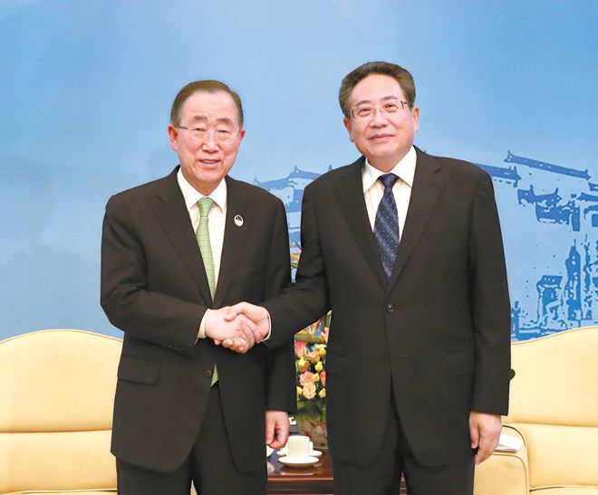省委书记李锦斌在合肥稻香楼宾馆亲切会见了联合国前秘书长、博鳌亚洲论坛理事长潘基文等国际组织代表