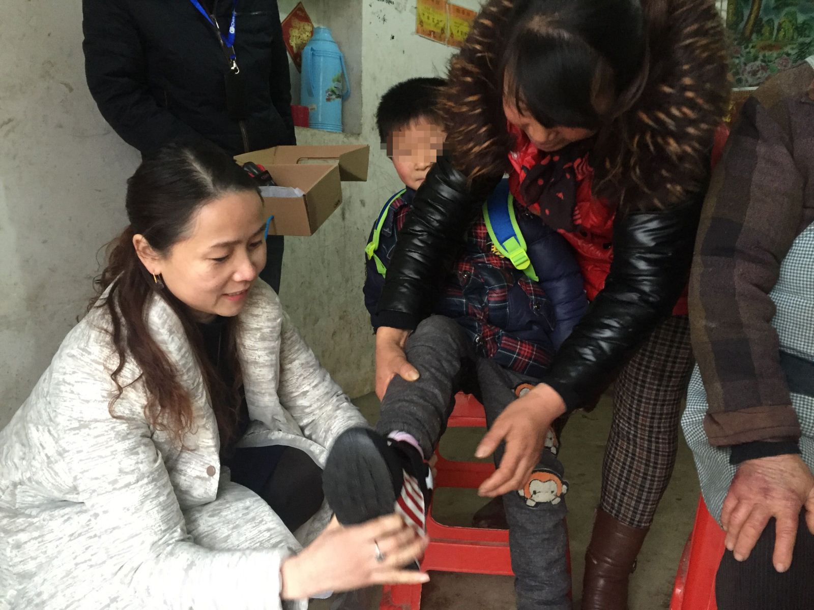 (童心桥公益发展中心副理事长春梅女士给小良换上新鞋)