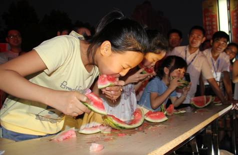比赛首先进行的是儿童组,小朋友们都亮出自己的大胃口,都说大胃王只属于男生,比赛中女孩子不甘示弱,狼吞虎咽的啃西瓜。经过了四轮的精彩PK,儿童组的冠军由朱将威小朋友夺得,赢得白帝儿童牛奶一箱,陈浩东和张梦婷则获得了亚军和季军。