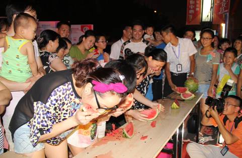 接下来成人组的比赛中,战况异常激烈,男生队队员们为确保能在最短的时间内吃完,各位精英壮汉纷纷使出浑身解数,拼命的将西瓜塞进嘴里。女生队更是令人刮目相看,优雅的形象早已抛诸脑后,这个时候,只有胜利才是最重要的事情。