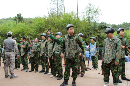 为了让大家能完全融入战士这一角色,教练先对大家进行分队、喊口号、搭肩按摩、捶背、敲敲头等热身运动,接着讲述了战地的情况和装备的使用方法。随后所有人换上迷彩服,分成防与守两队,在紫蓬山坡上玩起了真人CS。在刺激紧张的比赛中,大家学会了团队协作的重要性,认识到了群体的作用。