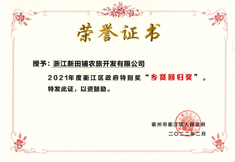新田铺农旅开发有限公司荣获“衢江2021年乡贤回归奖”