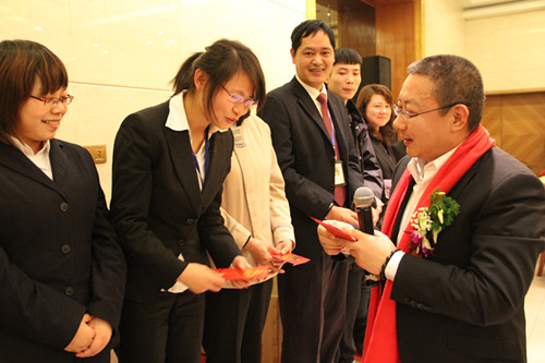 (集团公司执行总裁乔晓戈为中奖员工发红包)